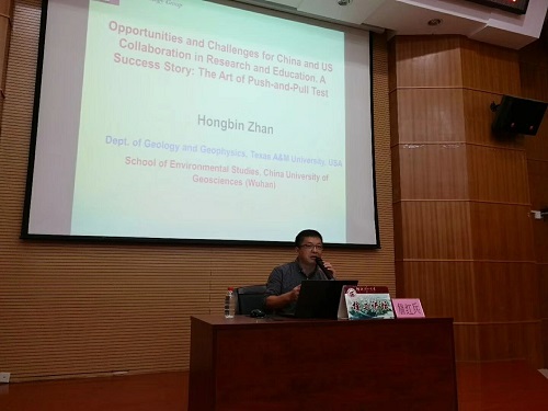 邀请,美国德州农工大学地质地球物理系终身讲座教授詹红兵在雁山校区萃华楼报告厅进行学术报告,题目为“Opportunities and Challenges for China and US Collaboration in Hydrogeological Research and Education. A Success Story: The Art of Push-and-Pull Aquifer Test(中美水文地质研究与教育合作的机遇与挑战)”。