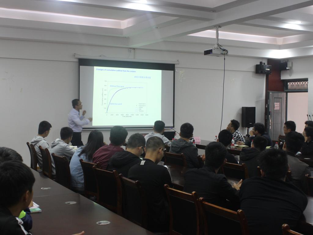 这是一场学术氛围浓重的讲座。过程中,教授平易近人,用十分温和的语气,介绍了自己在地下水科学与工程领域的工作。首先,教授解释了传统模型的不足,然后讲述了自己对与建立模型的想法、实践方法以及取得的成绩,同时也十分客观地说明了自己模型的缺点。接下来,匡教授针对“珠江三角洲溶质运移数值模拟”和“黄河源区同位素示踪研究”两方面做了汇报。期间,匡教授声情并茂地讲述了团队在进行水样采集工作时的趣闻。在场观众听得热情高涨。在最后的解疑环节,在地下水科学研究方面的专业老师及学生也提出了自己的疑问,在匡教授耐心地解惑之后,讲座在掌声中结束。