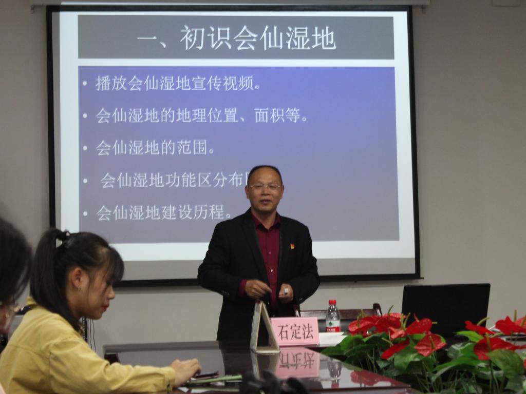 讲座初始,石定法书记播放了会仙湿地介绍视频,使同学们对会仙湿地有了初步的了解。接着,石定法书记就会仙湿地的自然景观、科学价值、文化艺术为同学们描绘了会仙湿地之美,并强调了会仙湿地的重要性。接下来,石书记从历史人物事迹讲述了会仙湿地的历史文化,以此让同学们对会仙湿地有更近一步的认识。讲座最后,石书记对如何保护好会仙湿地这个问题进行了解答,呼吁大家保护湿地并邀请同学们到湿地参观。