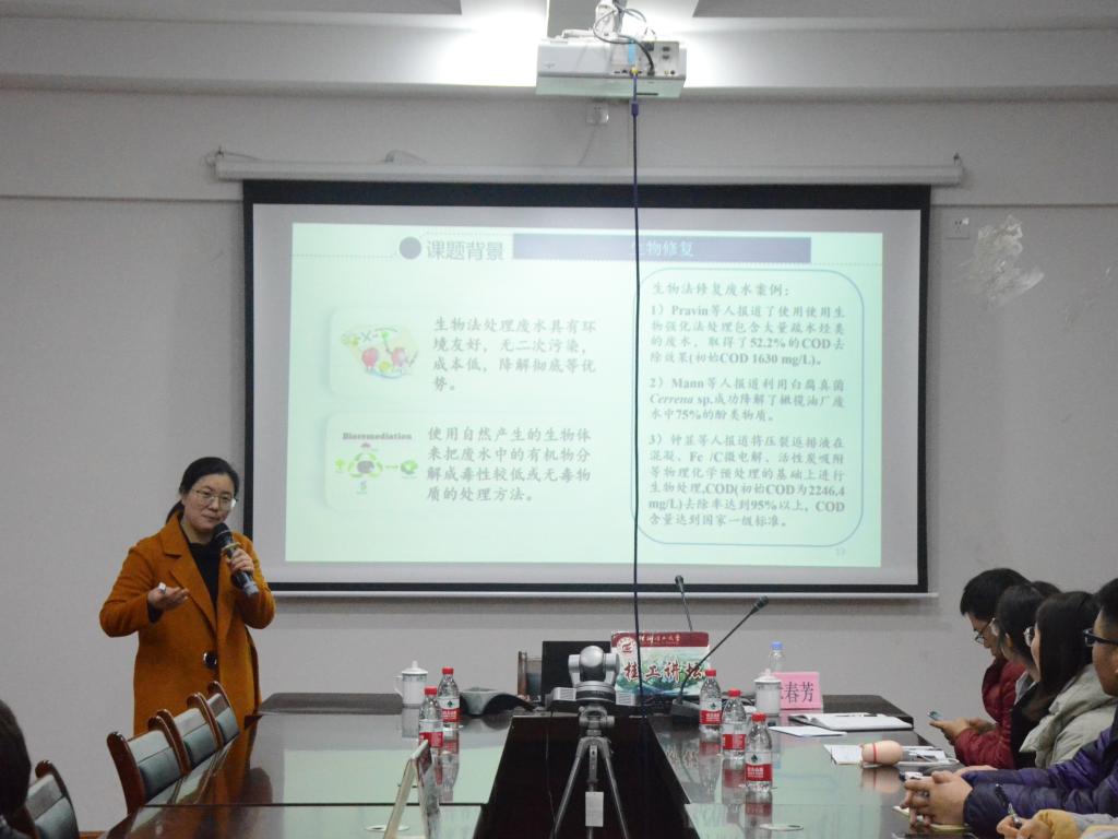 在报告中,章教授讲解了压裂返排液中含有的大量疏水性和难溶性有机物对生物修复的限制机理,同时提出解决方法——用土著生物表面活性剂产生菌进行压裂返排液的生物强化修复。章教授详细介绍了生物表面活性剂的作用和效果、生物表面活性剂的提取方法及其在处理压裂返排液过程中所起的作用及作用机理。同时,章教授还为正在做实验的研究生解答了许多实验中遇到的困惑,如石油烃的降解方式、生物表面活性剂的保存和相关生物的培育等。
