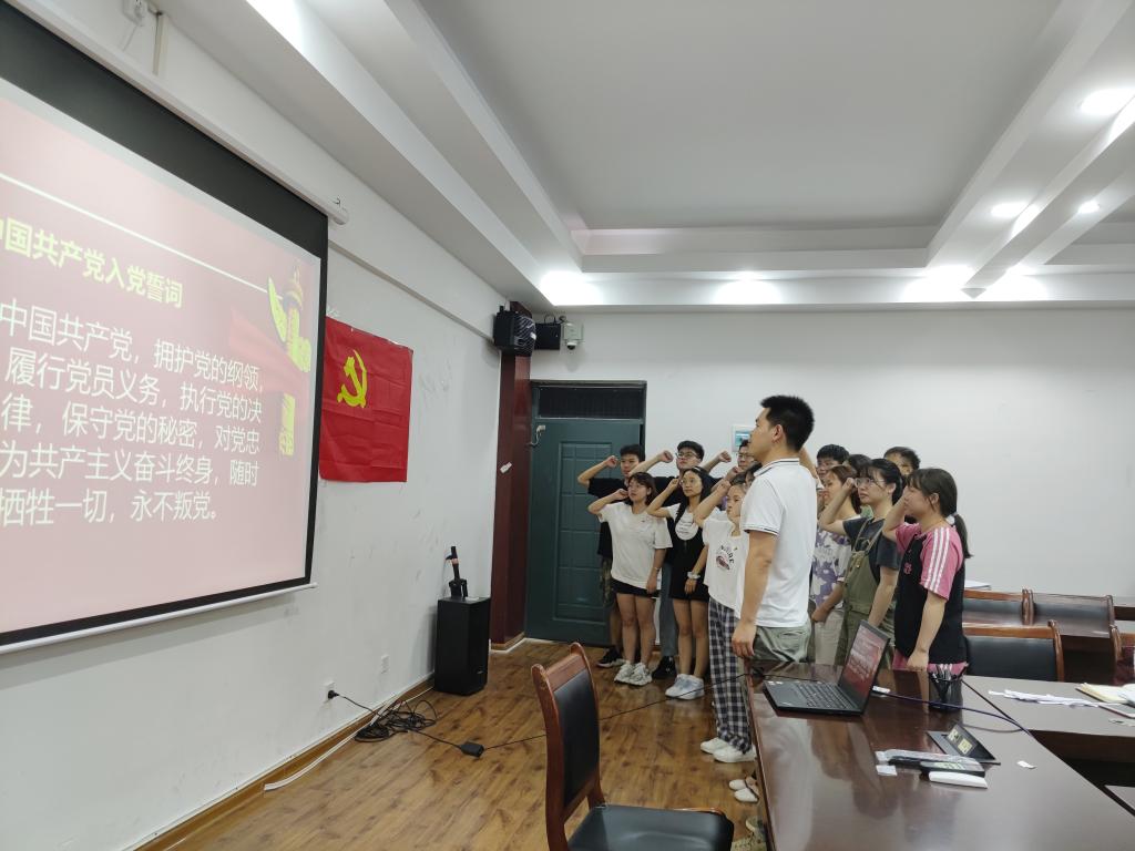 首先,党支部副书记张颖颖同志介绍本次预备党员接收会议流程,并表示会议严格按照接收预备党员的组织程序进行。随后,发展对象依次宣读入党志愿书,向党组织汇报自身对党的认识、入党动机、个人经历以及在校实际表现等情况。与会党员对各位发展对象的表现展开讨论,并给予了建议。会议认为谢美婧等十七名同志基本符合党员条件,经正式党员无记名投票表决,同意接收谢美婧等十七名同志成为预备党员。最后,孙老师带领预备党员面向党旗庄严宣誓。