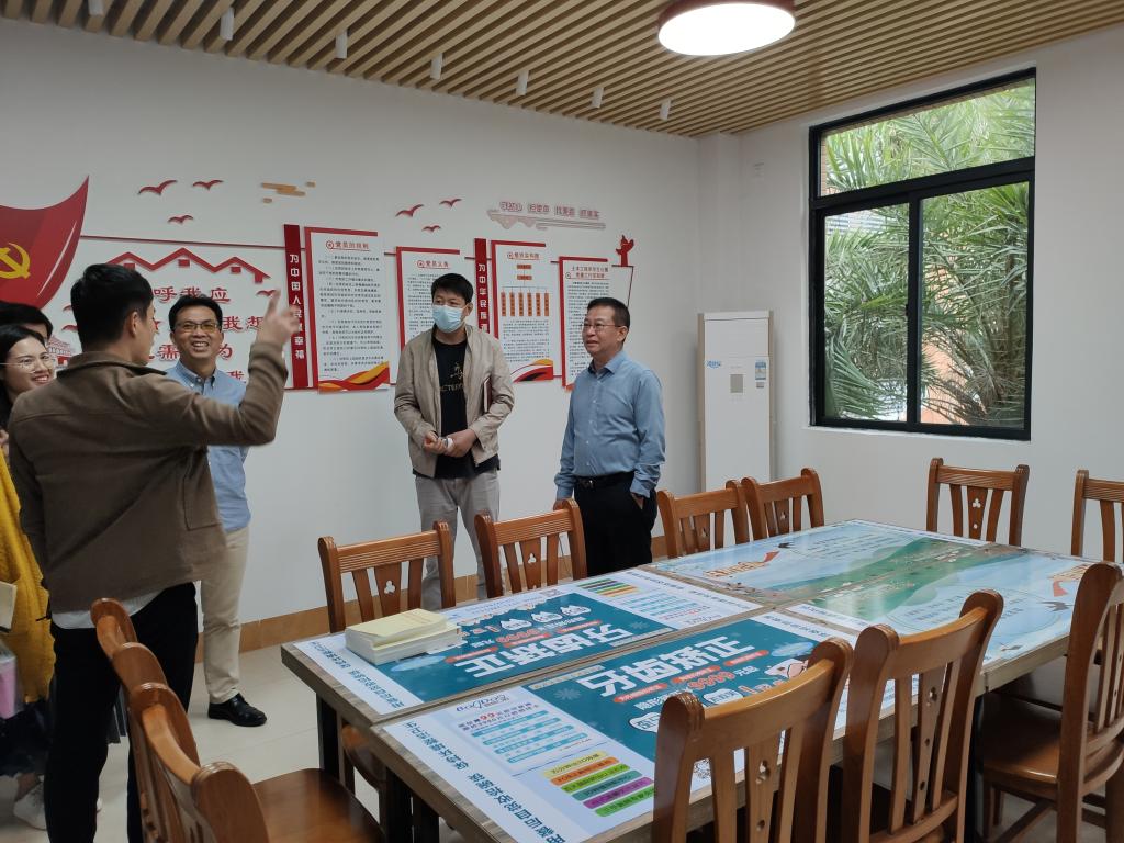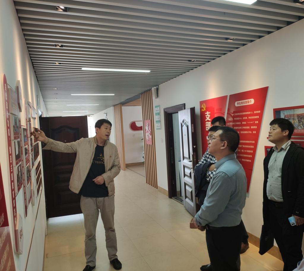随后,在土木工程学院党委书记孔祥刚、管理工程学院党委书记蔡明礼的带领下,一行人实地参观了标杆院系建设的文化长廊、“红船精神”墙、党员工作室等场所。