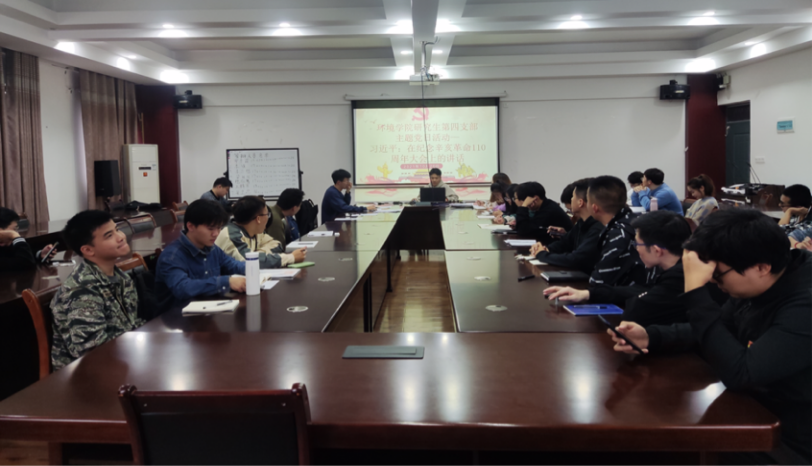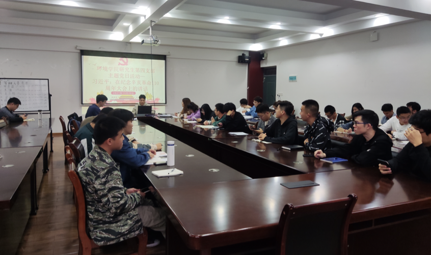 研究生第四党支部在12407会议室开展“学习习近平总书记在纪念辛亥革命110周年大会上的讲话”主题党日活动,全体党员参加会议,本次会议由支部副书记石谦主持开展。