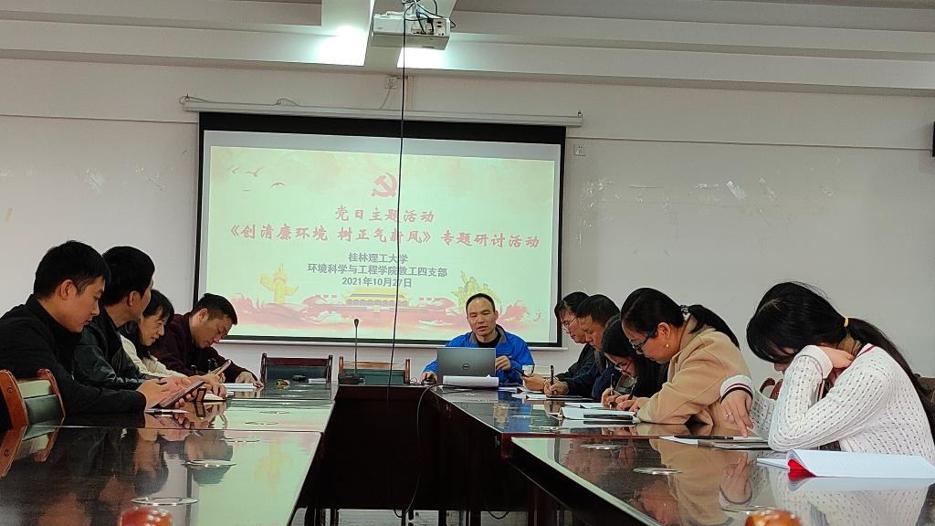 教工四支部在雁山校区12407会议室开展党日主题活动:《创清廉环境 树正气新风》专题研讨活动。本次党日活动由党支部书记梁延鹏主持,以“创清廉环境 树正气新风”为主题,重点以廉政教育、视频观看、案例研讨为内容,开展了“纪法同行”集中研讨与集体廉政教育。