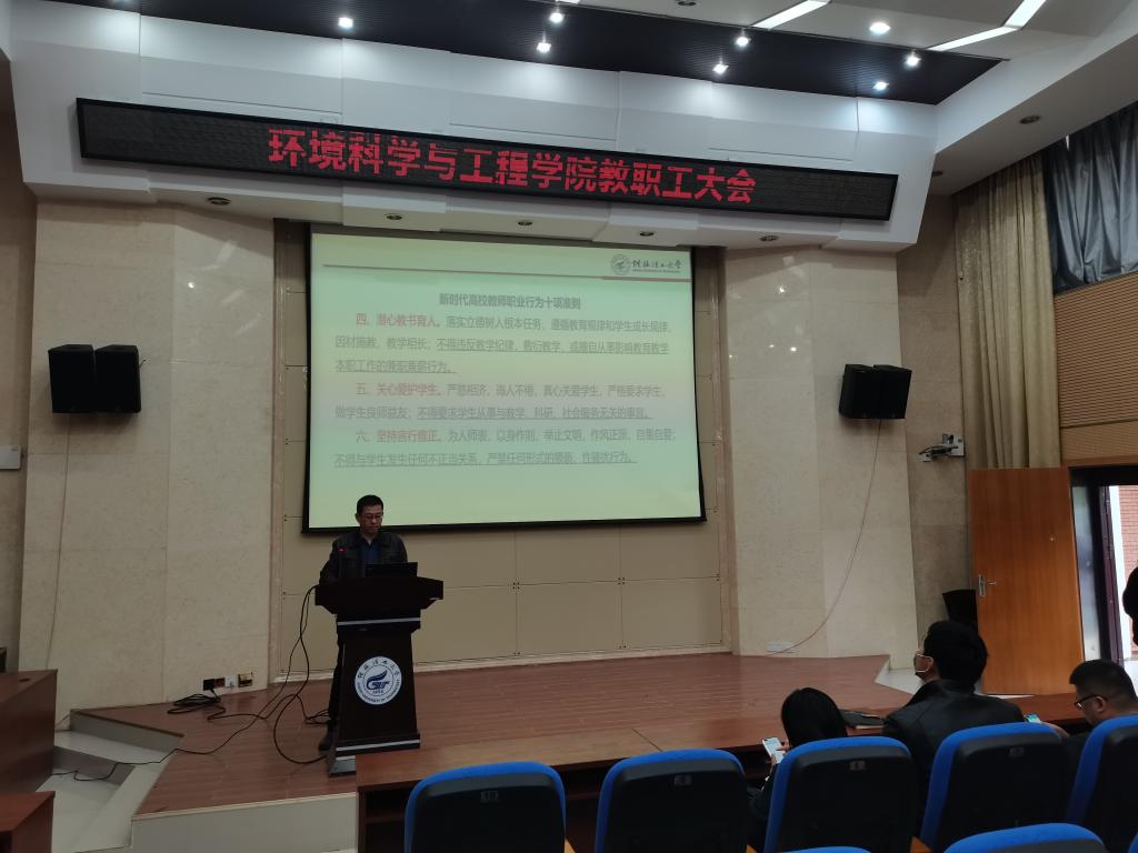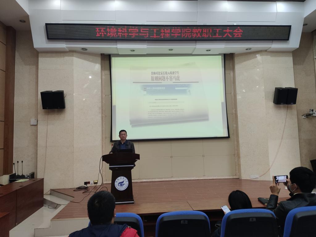 会上,首先,组织全体教职工认真学习了习近平总书记关于教育的重要论述和全国教育大会精神,深入落实《中共中央 国务院关于全面深化新时代教师队伍建设改革的意见》,推进实施教育部等七部门《关于加强和改进新时代师德师风建设的意见》,教育部下发的《关于在教育系统开展师德专题教育的通知》(教师函〔2021〕3号)、《新时代高校教师职业行为十项准则(教师〔2018〕16号)》等重要文件精神。其次,认真学习贯彻习近平总书记给全国高校黄大年式教师团队代表回信精神,姜书记强调到,要牢记为党育人、为国育才使命,大力学习弘扬黄大年精神,坚持为学为事为人相统一,推动学院教学科研育人各项事业高质量发展。最后,组织全体教职工观看《新闻1+1》八起典型案例,姜书记指出,大家从反面案例入手,警示我们保持对教育事业的忠诚心和纯洁心,不要因小失大,做一个踏实肯干浑身散发正能量的新时代教书人。