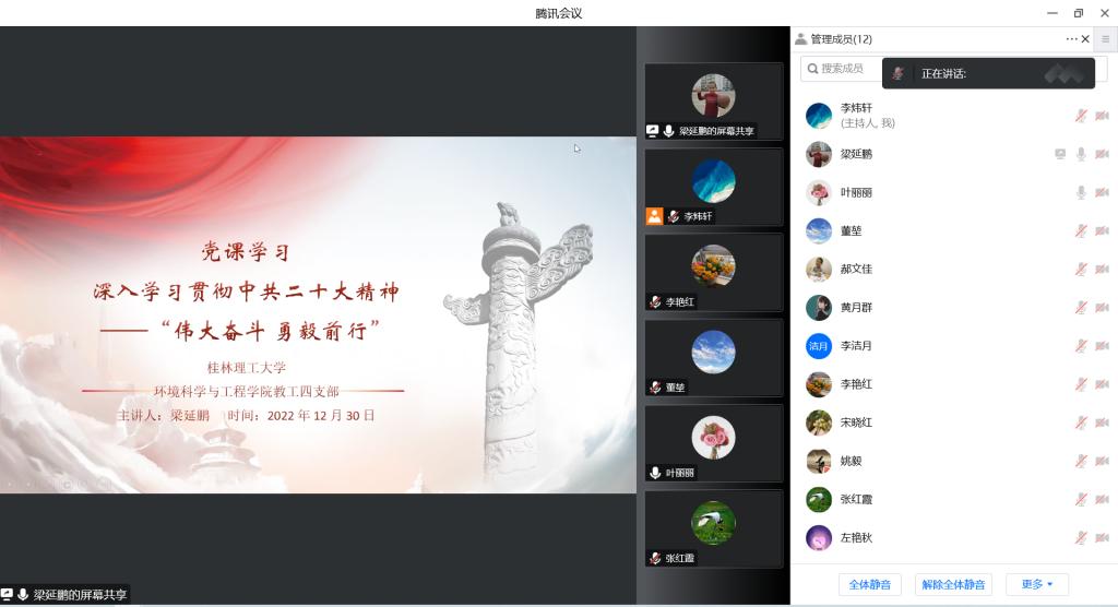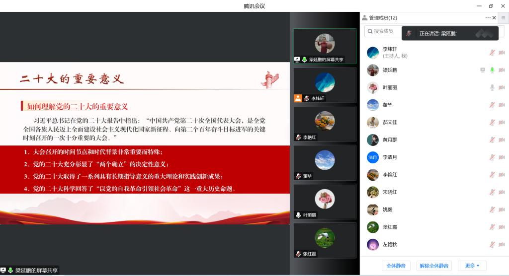 教工四支部于线上开展主题党课学习:深入学习贯彻中共二十大精神——“伟大奋斗 勇毅前行”。本次党课由支部书记梁延鹏同志主持,全体四支部党员教师参与。