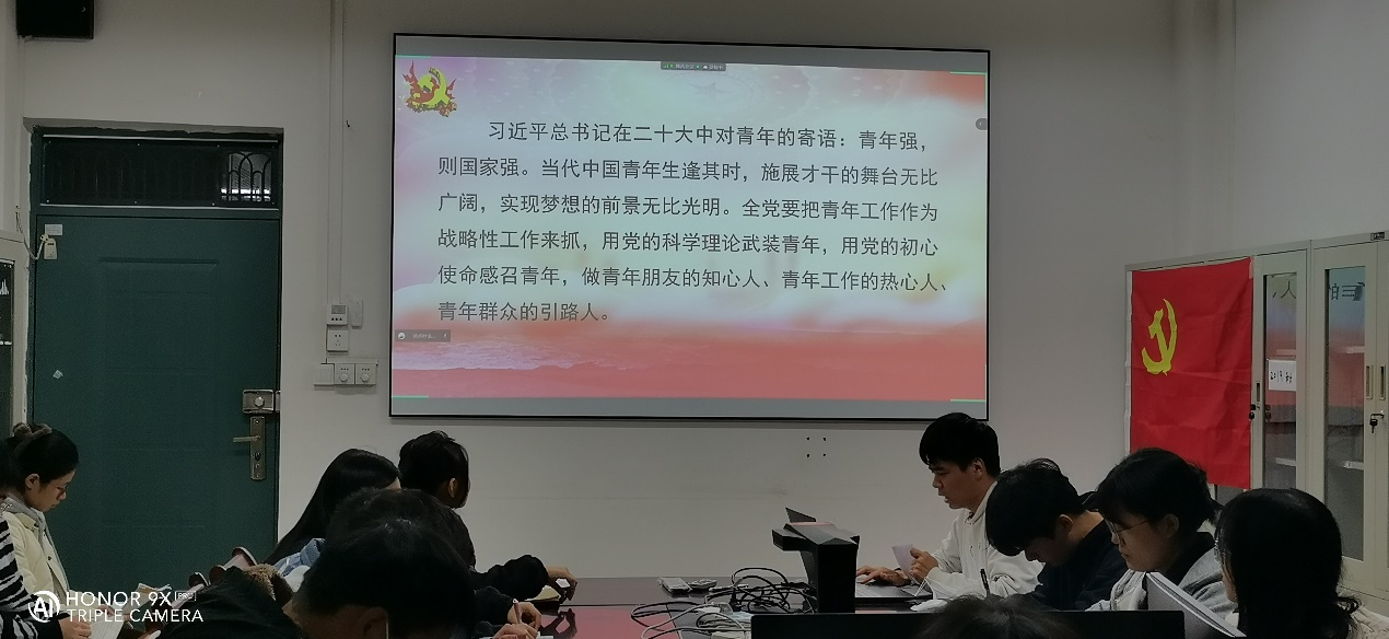 本科生第一党支部12414会议室开展“感悟习近平总书记在党的二十大中对青年的寄语——交流分享会”主题党日活动,全体党员同志参加活动,会议由支部副书记梁殷齐主持。