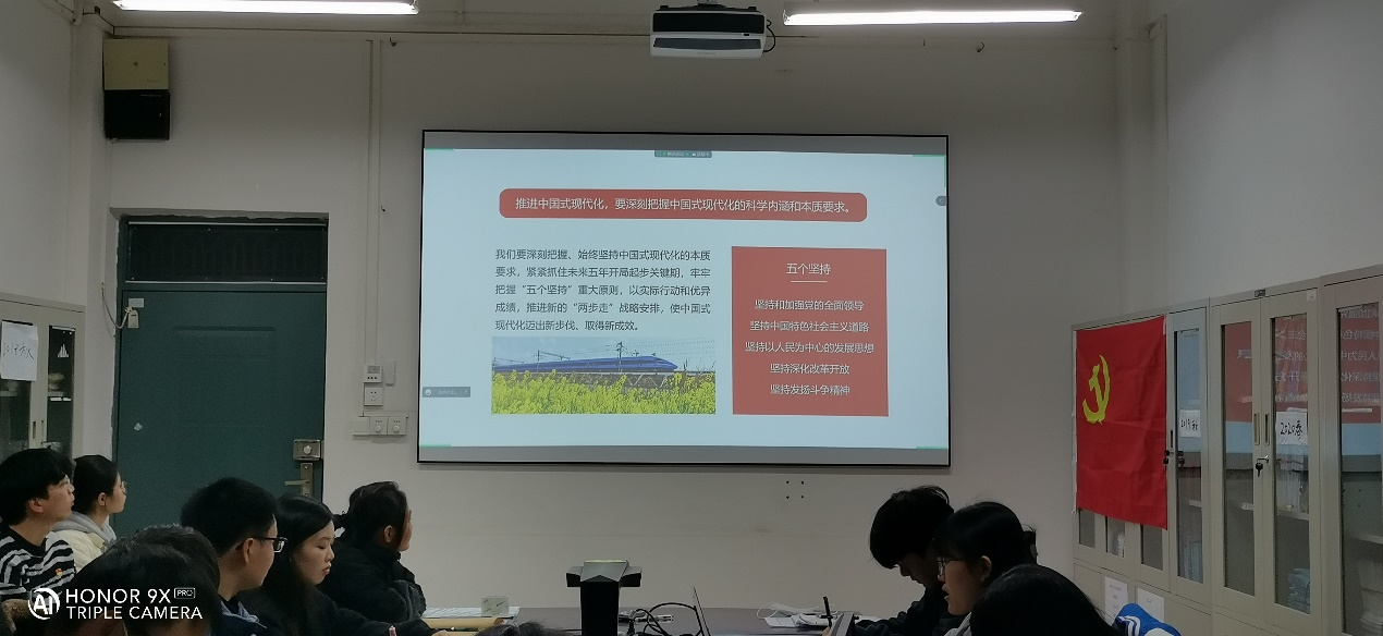 本科生第一党支部12414会议室举开展“党的二十大学习——以中国式现代化全面推进中华民族伟大复兴”主题党课活动,全体党员同志参加活动,会议由支部副书记梁殷齐同志主持。