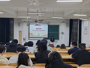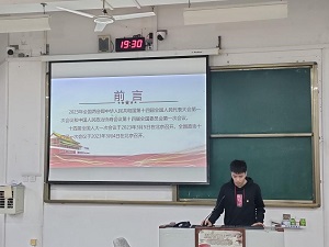 在05306教室举行了“聚焦两会—学习贯彻2023年两会精神”主题宣讲会。此次宣讲会由20级预备党员陈锡煜同志担任主讲人,共计200余名学生参加。