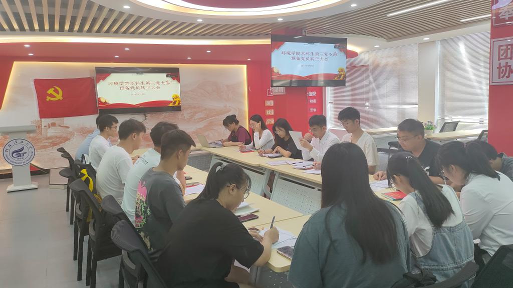 本科生第三党支部在雁山校区明园思政大讲堂召开了预备党员转正大会。本次会议支部书记孙云龙老师以及全体学生正式党员、预备党员到场参会,由支部副书记李茜茜同志主持本次转正大会,大会主要讨论关于周展雄等六名预备党员转正的问题。