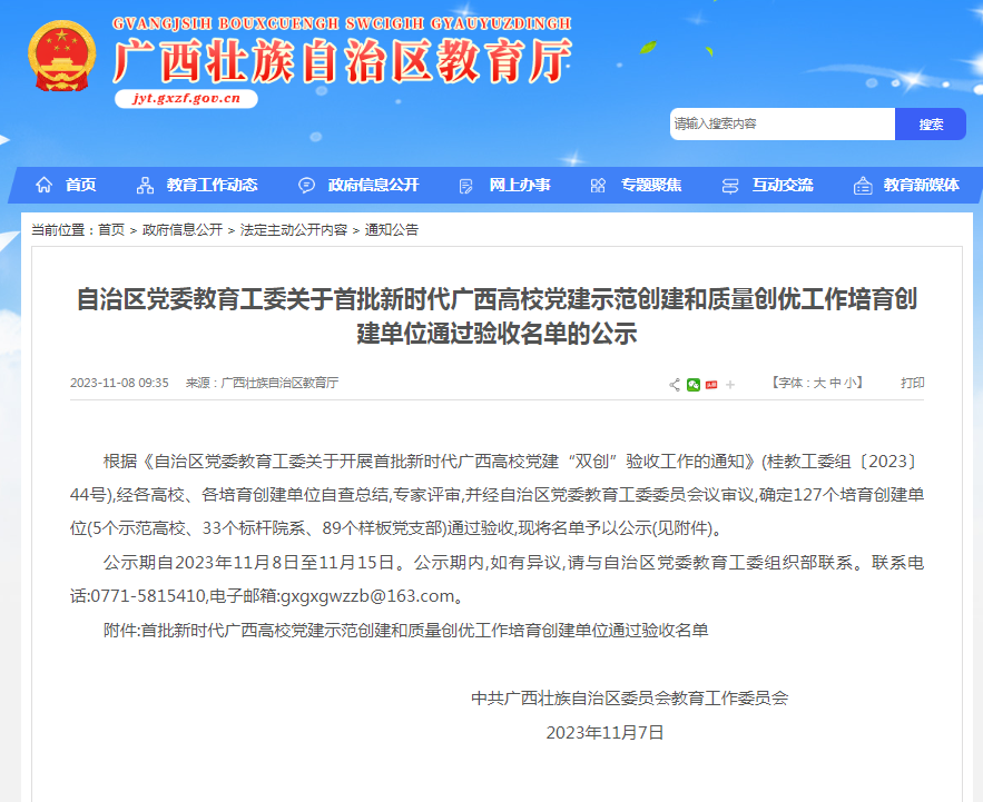 近日,自治区党委教育工委下发《关于公布首批新时代广西高校党建示范创建和质量创优工作培育创建单位验收通过名单的通知》,环境科学与工程学院党委顺利通过首批新时代广西高校党建示范创建和质量创优工作验收。