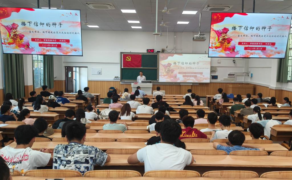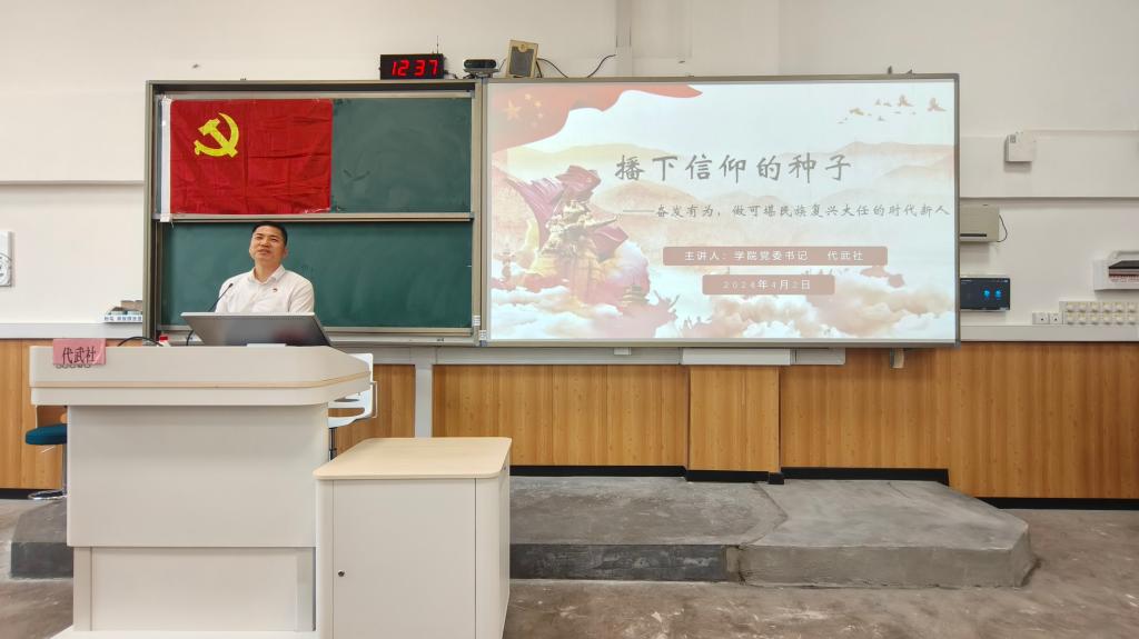 4月2日,学院党委书记代武社在雁山校区06207教室为2024年春季学期入党积极分子培训班学员讲授题为《播下信仰的种子——奋发有为,做可堪民族复兴大任的时代新人》的专题党课。本次党课由学院党委副书记叶大相主持,共有150余名学员参加培训。