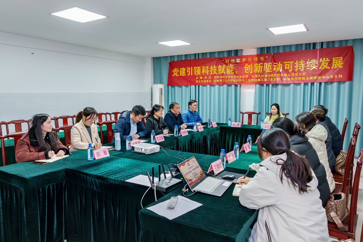 2024年12月16日,学院教工第三党支部联合桂林市科学技术局机关党委、恒晟水环境治理股份有限公司党支部、桂林市可持续发展促进中心党支部,在恒晟水环境治理股份有限公司联合开展“科技筑梦先锋号”党建品牌共建活动,为“科技筑梦先锋号”党建品牌共建揭牌,并围绕“党建引领科技赋能,创新驱动可持续发展”主题进行了座谈,共同开展党建工作研讨和创新科技研发合作交流。学院教工第三党支部书记朱宗强同志、组织委员许丹丹同志参加了此次共建活动。