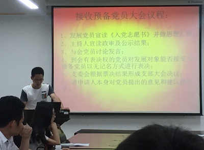大会开始,由黄老师发言,对此次会议进行期许与阐明,之后全体起立奏《国际歌》。随后发展党员逐一宣读入党志愿书并汇报了成为入党积极分子期间个人在思想态度、生活、学习、工作等方面的表现,指出其在日常生活学习过程中存在的不足。而后众党员对其进行意见提出。随后与会党员行使表决权对发展对象进行不记名投票表决。最后支部副书记周天燊同志强调,发展党员同志要按照党章严格要求自己,以身作则。