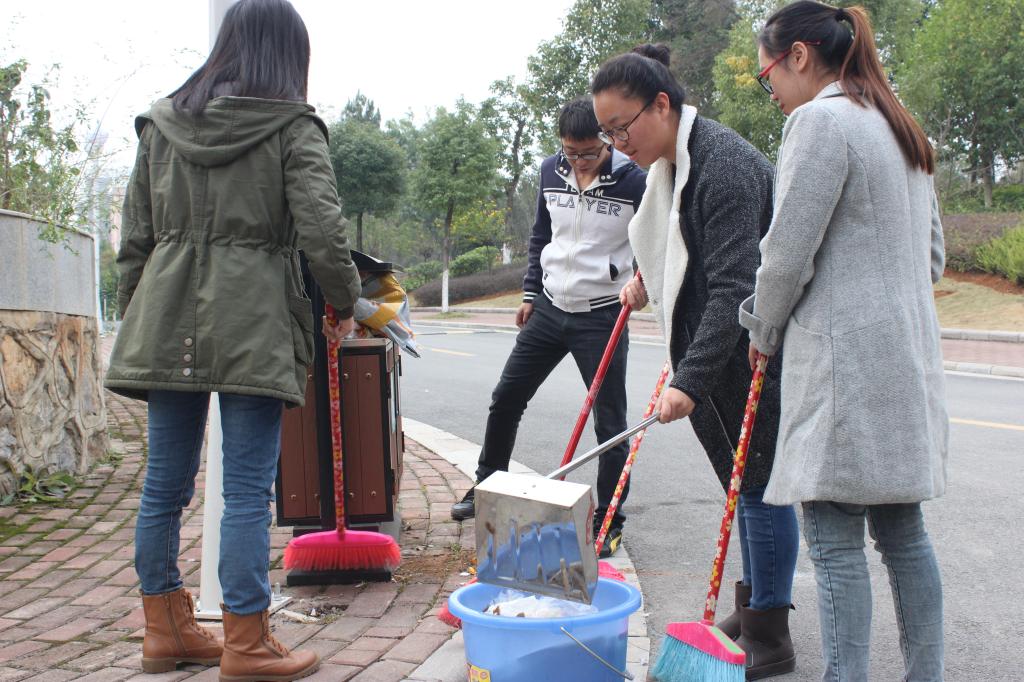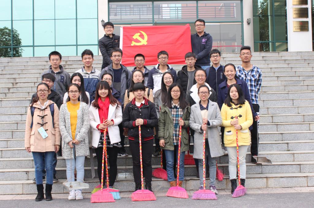 组织全体预备党员同志在萃华楼前进行党员志愿服务活动,同学们带着扫帚,垃圾铲等清扫工具进行校园清洁环境义务劳动。