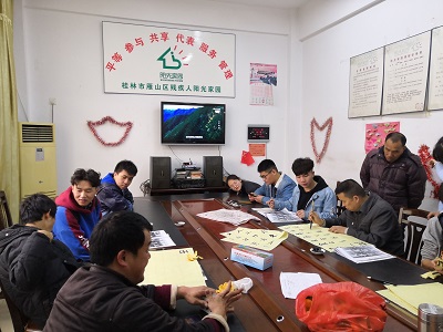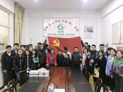 于2019年3月19日组织各支部入党积极分子及党员代表前往桂林市雁山区残疾人阳光家园开展关爱、慰问残疾人活动,本次活动由学院党建办主办,旨在让积极分子和党员同志在活动中学习到助人为乐,勇于奉献的雷锋精神;活动开展前,细心的同学们为他们提前准备了牛奶以及水果;下午2点50分,大家准时到达了活动地点,在阳光家园工作人员的热情引导下,同学们进一步了解到他们的生活状况;主要了解了他们生活、健康、出行、娱乐等方面的需求;期间,热心的同学们为他们剥水果,陪他们练习书法、下象棋、唱歌等;帮助部分残疾人完成饰品的制作。活动最后,大家聚集在一起合影留念。