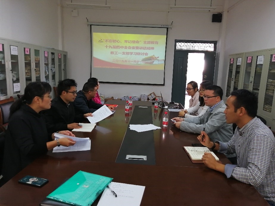 教工一支部在雁山校区12415会议室组织党课学习,学习主题开展“党的十九届四中全会精神”学习研讨会。本次会议由教工一支部书记夏源同志主持,学院副院长林华同志介绍了十九届四中全会公报的主要内容,传达了全会精神,并参与了讨论。