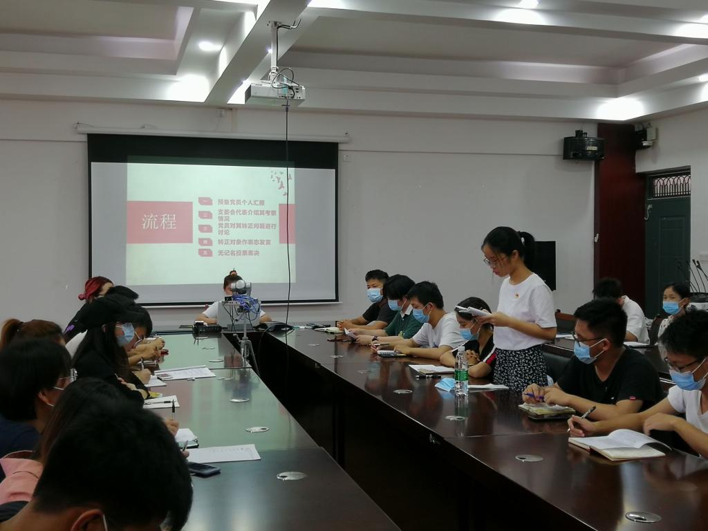 本科生一支部在12407召开2020年春季学期预备党员转正大会。本次会议由支部副书记罗美养主持,支部内全体党员参加,杨平平老师出席此次会议。本次大会对卢韦唯、黄全晶、黄青霞、黄计飞、王一甲5名预备党员的转正事宜做出讨论。