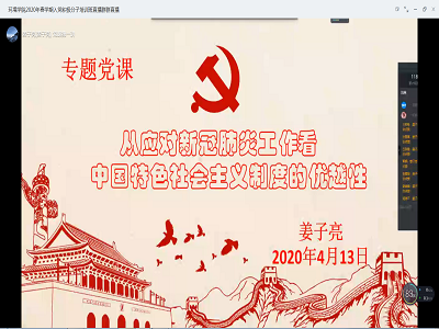 2020年春季学期入党积极分子培训班课程通过钉钉线上举行,学院党委书记姜子亮开展了“从应对新冠疫情肺炎工作看中国特色社会主义制度的优越性”的专题党课,培训班100余名学员聆听了党课报告。