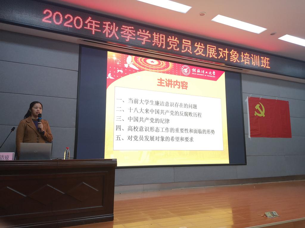 牵头主办的联合分党校2020年秋季学期党员发展对象培训班在雁山校区01501会议室开展了《党纪党章、意识形态及防范宗教校园渗透教育》专题党课,此次邀请外国语学院党委副书记邓洁琼为主讲人。