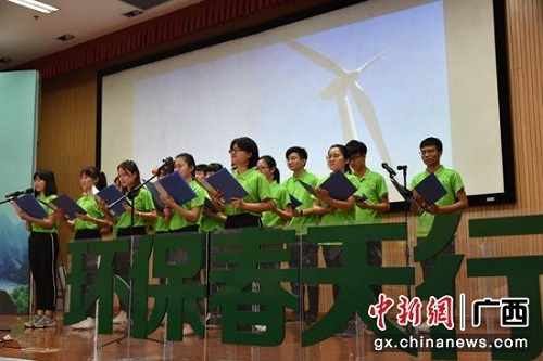 雁山校区图书馆报告厅,一群身着绿色T恤的同学齐唱《生态文明之歌》。当天,该校绿色行动之“悦享生态 绿色校园”环境文化节暨第六届“环保春天行”系列活动举行启动仪式。