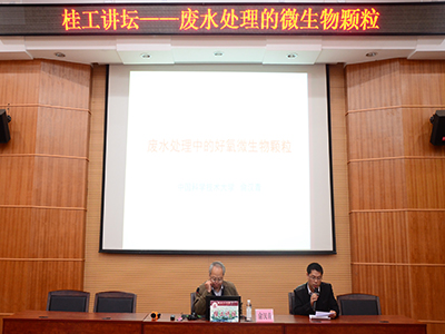 60周年华诞,在主持人对俞汉青教授进行介绍之后,俞教授为我桂工送上了最诚挚的祝福。此次的学术报告会,他详细介绍了废水微生物处理系统的固液分离和好氧颗粒微生物的优点及应用,尤其在好氧微生物方面进行深入研讨。会上,俞教授还通过现场互动形式提出一些科学问题来充实报告。比如好氧颗粒微生物是如何形成的?它有哪些基本的特征?如何保证其降解污染物的能力?特别是好氧颗粒微生物的形成过程,俞教授不仅介绍了好氧颗粒微生物的形成机制,还说明了好氧颗粒微生物的四个阶段。在介绍微生物特性表征的时候,也说明了微生物的不足之处,即存活时间不长。