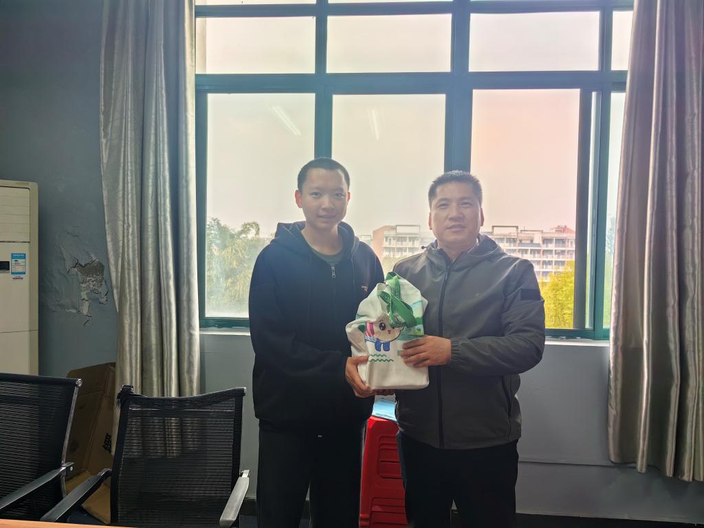 座谈会上,学院党委书记为即将入伍学生胡宏涛赠送了纪念品。